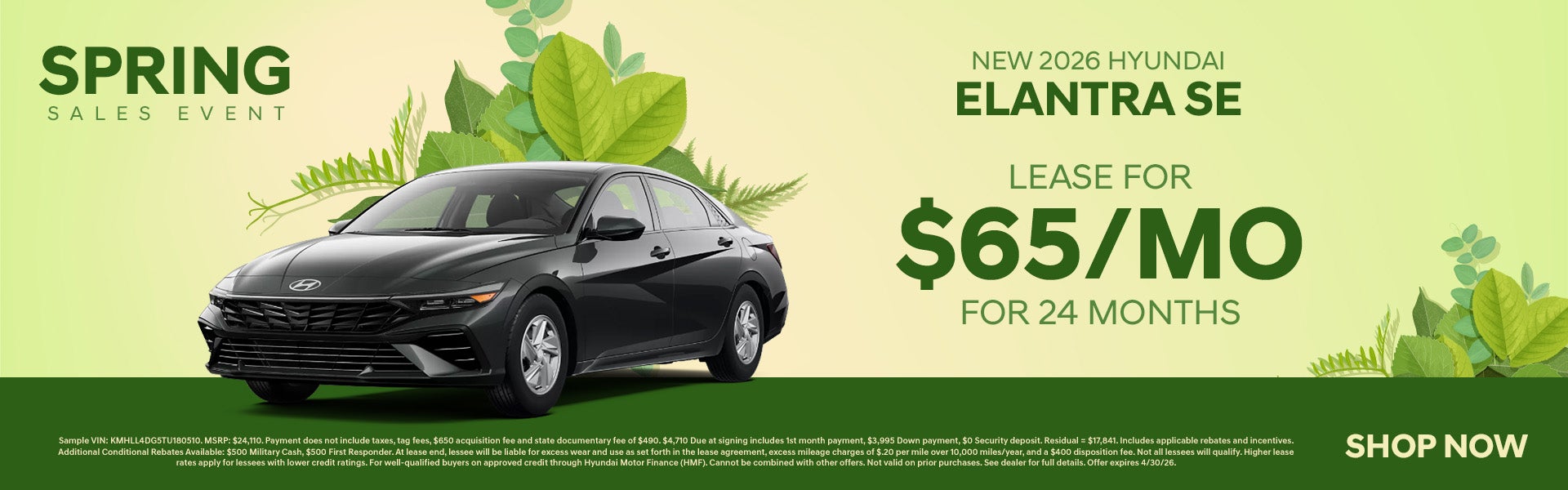 Sample VIN: KMHLL4DG5TU180510. MSRP: $24,110. Payment does not include taxes, tag fees, $650 acquisition fee and state documentary fee of $490. $4,710 Due at signing includes 1st month payment, $3,995 Down payment, $0 Security deposit. Residual = $17,841. Includes applicable rebates and incentives. Additional Conditional Rebates Available: $500 Military Cash, $500 First Responder. At lease end, lessee will be liable for excess wear and use as set forth in the lease agreement, excess mileage charges of $.20 per mile over 10,000 miles/year, and a $400 disposition fee. Not all lessees will qualify. Higher lease rates apply for lessees with lower credit ratings. For well-qualified buyers on approved credit through Hyundai Motor Finance (HMF). Cannot be combined with other offers. Not valid on prior purchases. See dealer for full details. Offer expires 4/30/26.